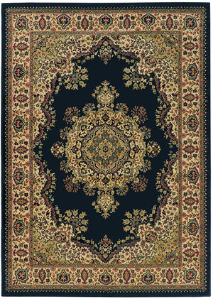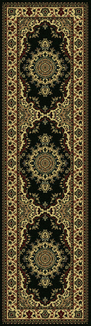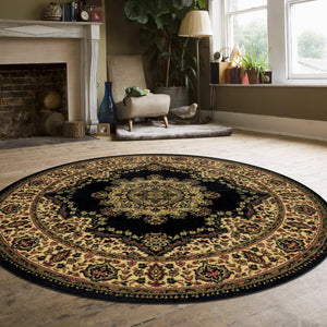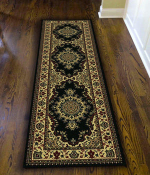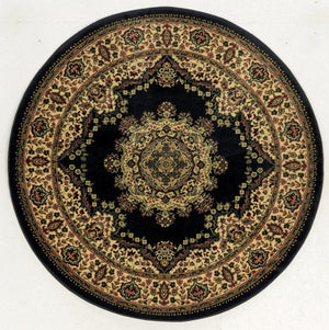 This complex sarouk medallion design is a classic pattern updated with tasteful modern touches to suit any space. The dominant deep black base is bordered by an intricate floral border to complete this traditional machine made design. Made of heat-set polypropylene, this rug provides a soft, non-shedding, durable, and easy to clean accent to the decor in your entryway, hallway, bedroom, playroom, dining room, or living room. A wide array of sizes and shapes, including rectangles, rounds, and runners, allows this machine made rug collection to fit in any space comfortably.