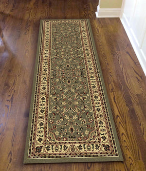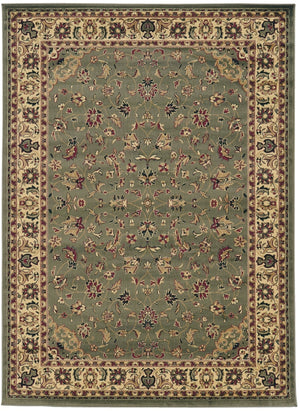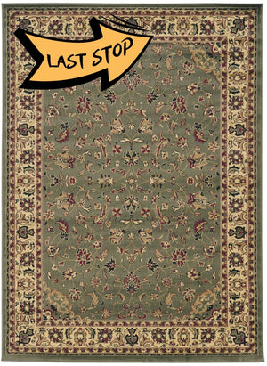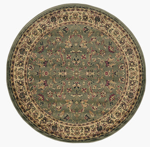 This complex floral sarouk design is a classic pattern updated with tasteful modern touches to suit any space. The dominant soft green base is bordered by an intricate floral border to complete this traditional machine made design. Made of heat-set polypropylene, this rug provides a soft, non-shedding, durable, and easy to clean accent to the decor in your entryway, hallway, bedroom, playroom, dining room, or living room. A wide array of sizes and shapes, including rectangles, rounds, and runners, allows this machine made rug collection to fit in any space comfortably.
