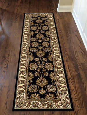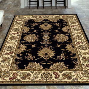 This timeless oriental design is a traditional floral pattern updated with tasteful modern touches to suit any space. The dominant black base is bordered by an intricate floral border to complete this traditional design machine made in Italy. Made of heat-set polypropylene, this rug provides a soft, non-shedding, durable, and easy to clean accent to the decor in your entryway, hallway, bedroom, playroom, dining room, or living room. A wide array of sizes and shapes, including rectangles, rounds, and runners, allows this machine made rug collection to fit in any space comfortably.